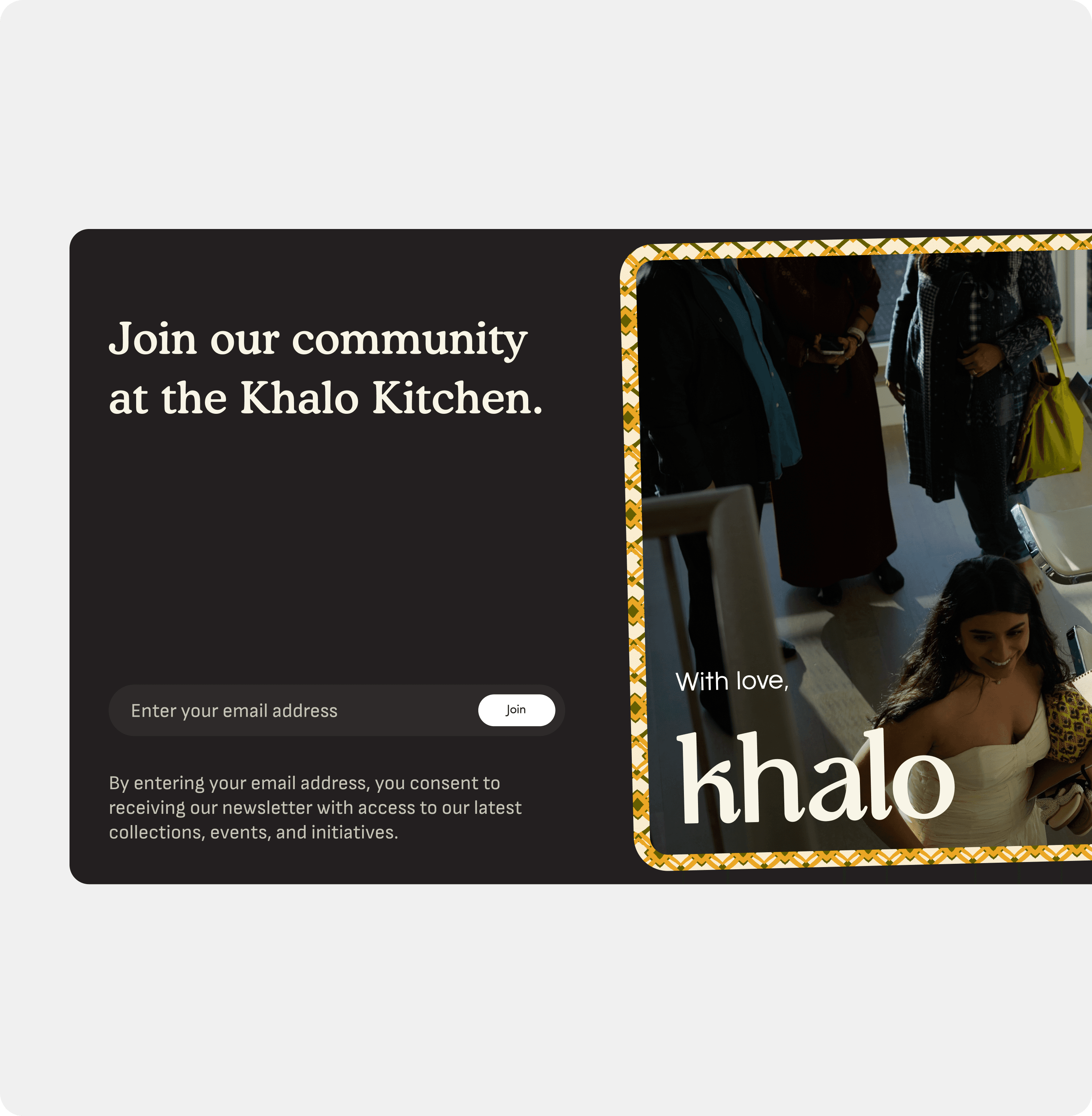 Strategic placement of email capture CTA that allows Khalo to create a contact sheet while users earn access to community.