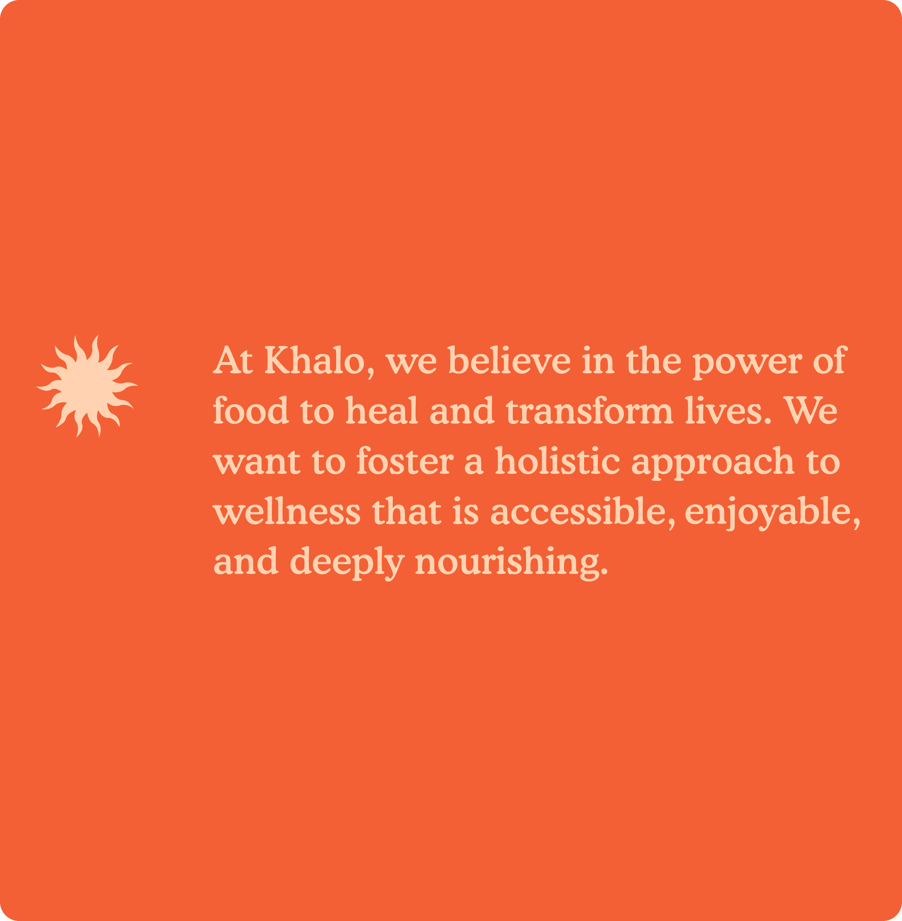 At Khalo, we believe in the power of food to heal and transform lives. We want to foster a holistic approach to wellness that is accessible, enjoyable, and deeply nourishing.